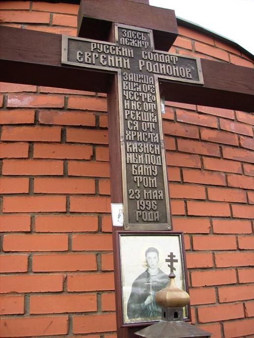 “Здесь лежит русский солдат Евгений Родионов, — начертано на кресте, установленном на его могиле, — защищавший Отечество и не отрекшийся от Христа, казненный под Бамутом 23 мая 1996 года”.