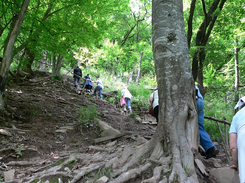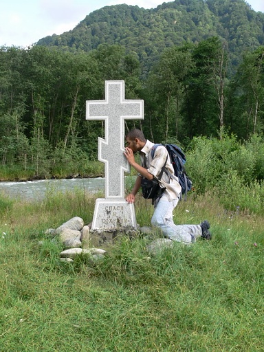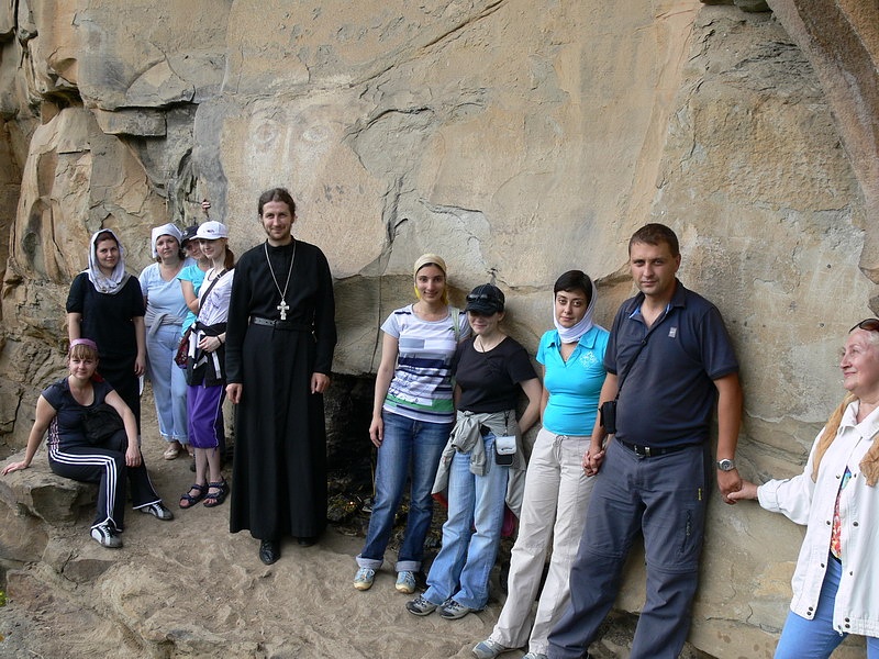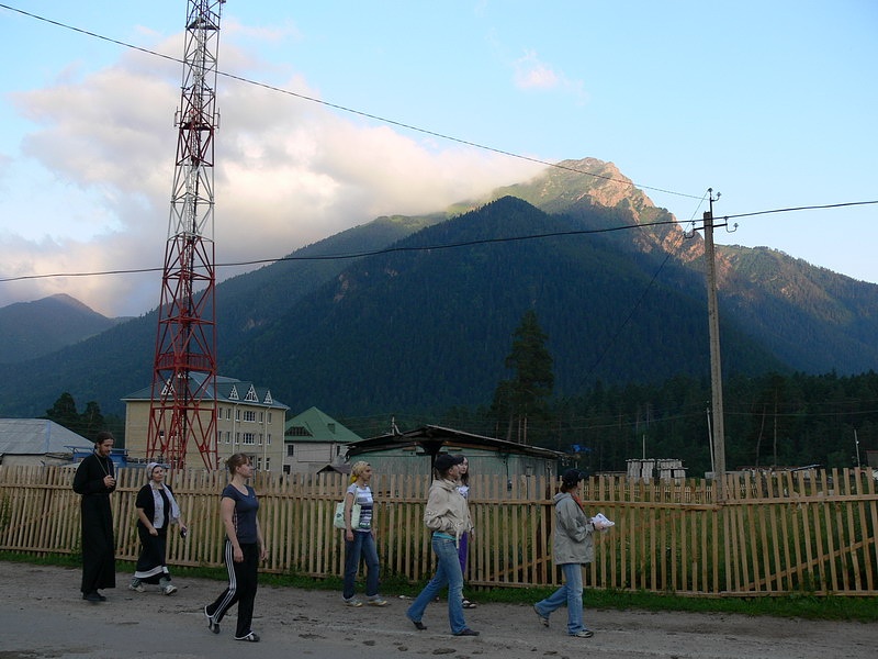 Приехав в поселок Нижний Архыз, мы оставили вещи на уютной базе отдыха, перекусили. И вот мы направились к главной цели нашего первого дня – к известному наскальному изображению лика Христа Спасителя. Недолгое восхождение по заботливо кем-то созданной импровизированной лестнице – и мы у цели. Сложно описать то разнообразие мыслей и чувств, которое охватывает тебя, когда ты стоишь перед Ликом. Подумать только – он был создан много веков назад, возможно одним из иноков, подвизавшимся в этих краях! Каких высот святости он достиг в своем подвиге, и какие плоды принес Господу! И кто знает, может совсем рядом в горах ютится небольшая келья какого-нибудь инока-отшельника, ушедшего из мира подальше от людей в горы, чтобы быть ближе к Богу… Мы же прочитали акафист Иисусу Сладчайшему, приложились к иконе. Затем отправились в наш лагерь. Этим вечером было свободное время. Несколько человек, например, включая и автора данной заметки, предприняли прогулку по окрестностям – хотелось увидеть больше прекрасных видов, запечатлеть их в своей памяти.