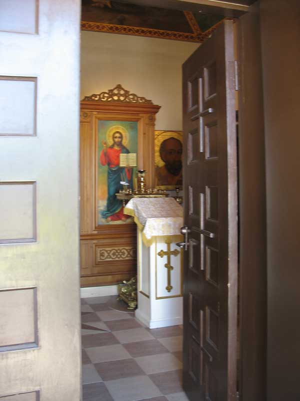 Двери южного входа. В храме читается акафист иконе Божьей Матери "Всецарица".
