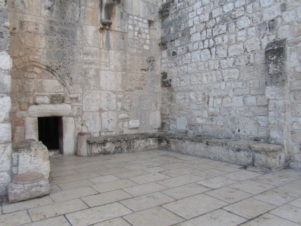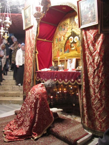 Вертеп находится в крипте храма под главным алтарем. В него ведет спуск из 15 ступеней. Мы пришли, когда служба только началась.