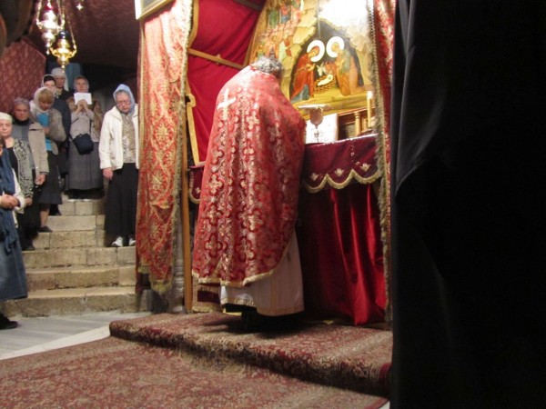 В Вифлееме живет много православных арабов. Впервые слышал литургические возгласы на арабском. Вначале ассоциативно вспоминаешь крики муэдзинов на минаретах, которые здесь приходиться слышать довольно часто. Но на Литургии арабский звучит совершенно иначе, как-то мягко и проникающе. Впечатление необычное, но весьма благоприятное. Оценил певучую красоту этого языка. Кстати, православные арабы называют Спасителя - Аллах Иисус Христос. Так что возглас «Аллах акбар!» может быть вполне наполнен христианским содержанием.