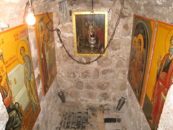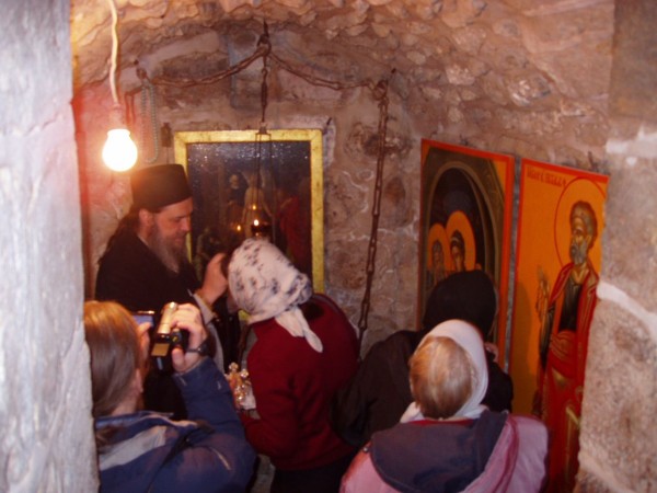 Мы пропели тропарь апостолу Петру и я прочитал 6 главу Деяний Апостолов, где описано это чудо, причем, я читал, находясь прямо в темнице. Яркое чудо живо представилось воображению. На стене темницы помещены три иконы большие иконы, изображающие разные эпизоды жизни апостола, в том числе и его заключение в темницу. Над иконой висят цепи. Григорий поспешно пояснил, что это копии тех, цепей которыми был скован первоверховный апостол. Подлинные были вывезены крестоносцами и находятся в Риме. В честь них установлен особый церковный праздник - поклонение веригам ап.Петра (16/29 января). Мы поклонились этой копии, воздавая таким образом честь подлинным узам страстей апостола.