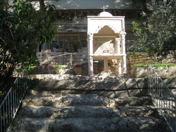 Войдя в монастырь, мы остановились у стеллы, нужно было получить благословение настоятельницы. Наш путевод сказал, что мы сейчас находимся на том самом месте, где почивали апостолы в гефсиманскую ночь в то время, когда Господь молился на камне о чаше страданий. На небе светило солнце, дул ветерок, на земле бы мир и во всех нас благоволение. И на фоне всего этого трудно было представить, что именно здесь Господь наставлял Своих учеников: «Бдите и молитесь, да не внидите в напасть» (Мк.14,38). Именно эти слова мы и прочитали на каменной стеле у входа пещеру, где находились апостолы во время гефсиманской молитвы Господа. В ней устроена церковь, как помниться, во имя апостола Петра. Мы помолились, чтобы Господь и нам помог стяжать дух бодрствования и молитвы.